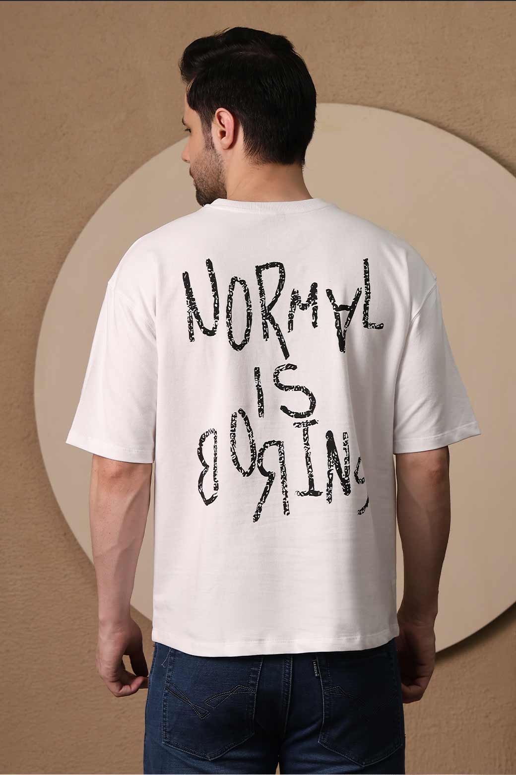 The Anti-Normal T-Shirt challenges conformity through contrast. The abstract splash on the front brings chaos, while the flipped “Normal is Boring” text on the back reinforces disruption.